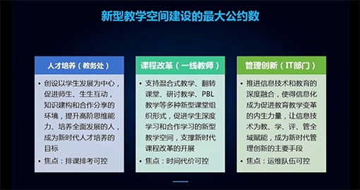 校方不同的“受益者”期望各自能得到高效率服務的同時更注重可控性、便利性、易管理性等不同維度的要求。因此,只有設備的智能化還遠遠不夠,要實現整個系統人性化的靈活可變與服務上的智慧升級才能滿足教學空間全面的需求。