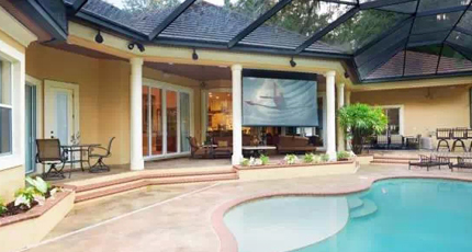 客戶有個非常棒的室外游泳池,他希望更新音響系統,同時再增加一臺電視機。他提出了露天劇場的想法,但要求很高:即不論是從游泳池還是從露臺區都能使用該露天劇場。比較常規的做法是增加一臺電視機,但是原有電視機屏幕太小,并不適合現在的應用。那么,就更換掉原有位置上的電視機,然后在同一個位置上安裝兩塊投影幕和兩臺對應的投影機嗎?這不僅增加成本,他們還得再去尋找合適的位置來擺放那兩臺投影機。
