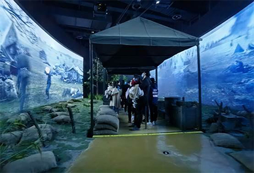 海瀾馬文化博物館中沉浸式體驗館就用到疊加投影實現被動3D的方案,在“克羅加提”主題展項中,采用二戰時期戰場的布置渲染戰爭氛圍,然后通過投影機在兩側墻面投影3D場景,還原戰爭畫面。