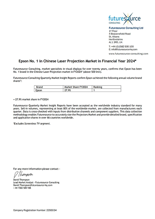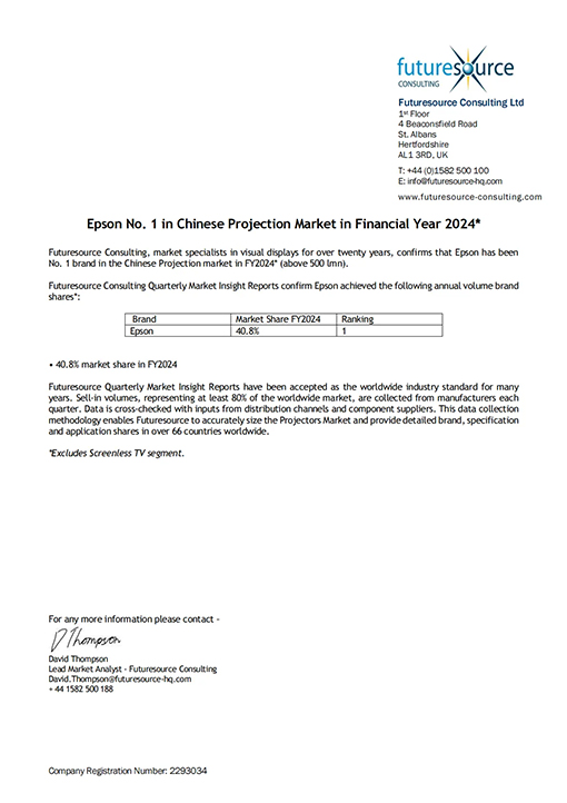 愛普生投影機(jī)憑借核心技術(shù)、不斷迭代的產(chǎn)品方案及專業(yè)安心的服務(wù)保障,2024財年市場份額再次位列中國投影機(jī)市場第一*1。也是連續(xù)23年獲得全球投影機(jī)市場份額第一*2。