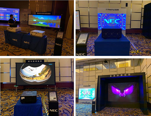 授牌儀式過后,NEC投影機產品經理張凱向大家翔實地介紹了移動式全景投影、全息紗幕投影、立體模型投影等新品解決方案。現場,醒目又炫酷的“NEC”LOGO格外吸睛,運用2萬流明英雄系列PX2000UL+