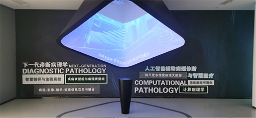 對于病理的研究,不光是應用在當下臨床醫學,未來遠程診斷發揮空間更廣。在下一代診斷病理學區域,可以看到傘形環繞腔體內展示著實驗室關于人工智能輔助病理診斷的最新研究成果,將病理、影像、組學與臨床信息交叉融合,組成多維度病理大數據。腔體內采用4臺NEC騎士系列投影機CS3300WL,4000流明亮度,0.52投射比的短焦鏡頭,打破空間狹小限制,短距離即可投出大畫面。此外CS3300WL支持360度安裝,搭配豐富幾何校正功能,安裝更加便捷。小巧機身完美“隱藏”在腔體內,打造沉浸體驗空間。