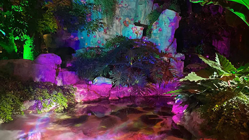 以“高亮+輕量”為重要支點的NEC杰克系列激光投影機,發揮其出色視覺效果、便捷安裝的優勢,以假山為幕,融合聲、光、電等體感元素,隔絕一方瀲滟靈動的生態水景。風云變幻的天氣,光影律動的霧森,將大自然的神奇壯美展現得淋漓盡致。