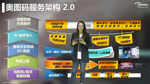 2年前,奧圖碼的布局詮釋了更完整的解決方案鏈條。從最底層的顯示終端到浮于硬件產品的發散性內容創作,有了“產品廠商”、“集成商”、“中控系統提供商”(1-3層)聯合打下的基礎,AI技術便是這“智慧時代”的增值點。奧圖碼在1年前便建立了AI技術中心,致力于將更新的智慧技術帶入到1-3層的各部分中。最后,在優質硬件、高端技術的加持下,為良好的、新穎的內容IP創作提供堅實的后盾與強大的源動力。