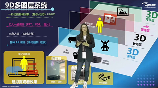 “9D多圖層系統”是奧圖碼針對教育領域的解決方案。從理念上,多層的“3D”架構讓傳統的線上教學脫離“2D”的束縛,背景、教師、課件標志物三方面的“3D”化在學生的眼中形成一個整體,無論是從知識理解的清晰度還是教學趣味性來講,其而所創造出的實際教學效果相較傳統線上教學顯然是十分卓越的。而下降到底層的產品,這一切將通過電腦、手機、投影機或是VR/AR/MR的方式呈現。