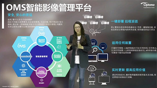 在解決方案實施的管理上,奧圖碼同樣作出了“智慧”的舉措。OMS智能影像管理平臺可應不同場景需求,通過單一控制面板及指令對投影機、互動白板、大型LED顯示屏等設備形成監控、管理,實時排查問題,形成一對多的“顯示管理群組”。