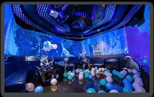 一個包房、三五成群的好友、如果遇上一兩個麥霸,其他人有事就只有把酒尋歡,或者獨自默默地刷著手機,沉浸式K房還有先進的桌面互動投影系統,投影在桌面上各種新奇有趣的畫面以及可觸碰的小游戲,不唱歌的朋友們此時也可以一起玩桌面互動游戲。