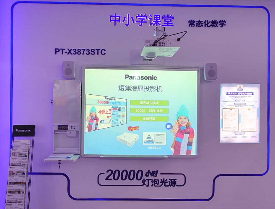 帶有“藍(lán)光減少模式”的短焦投影機(jī)系列本次以PT-X3873STC為代表,展示了以中小學(xué)課堂為展項(xiàng)的應(yīng)用方案。松下短焦投影機(jī)PT-X3873STC同樣具有德國萊茵認(rèn)證的“藍(lán)光減少模式”,愛眼護(hù)眼,適合中小學(xué)課堂及培訓(xùn)教室使用。松下商教短焦投影配合白板與一體機(jī)使用即可進(jìn)行課件教學(xué),也可在隨時(shí)在屏幕上進(jìn)行書寫。 |