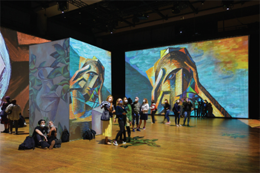 本次多媒體藝術展為捷克帶來了一個全新的理念,讓人們以不同的角度去欣賞藝術。它的特殊之處不僅在于藝術呈現的方式,即畫作并不是實體展示,而是以巨幅的投影形式呈現,還在于這些畫作所覆蓋的大面積空間。這些杰作被投影到展廳四面的高墻上、場地中間的兩根立柱以及地面上。3D環繞的美妙音樂結合投影影像,讓游客們置身其間,沉浸體驗。