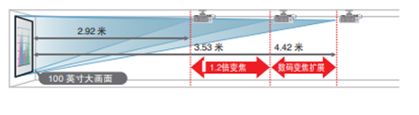 當投影距離超出投影機光學變焦范圍時,可通過全新搭載的數碼變焦擴展功能擴展投影距離。如投影100寸畫面時,可由光學變焦的3.53米投影距離擴展至4.42米。 |