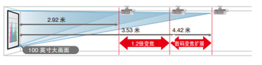 1,200像素)分辨率。同時(shí),1.2倍變焦鏡頭實(shí)現(xiàn)靈活的1.36–1.64:1投射比,可進(jìn)行近距離或遠(yuǎn)距離大畫面投影:適合大型或小型房間內(nèi)固定安裝。當(dāng)投影距離超出投影機(jī)光學(xué)變焦范圍時(shí),可通過全新搭載的數(shù)碼變焦擴(kuò)展功能擴(kuò)展投影距離。如投影100寸畫面時(shí),可由光學(xué)變焦的3.53米投影距離擴(kuò)展至4.42米。