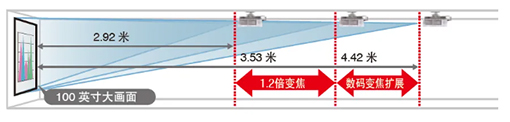 我們以PT-LMZ460C投影100英寸畫面為例,原本最遠的投影距離約為3.53米,啟用數碼變焦功能后,投影距離可以進一步擴展至4.42米。