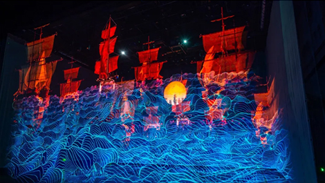 《最憶船政》中的投影設計秉承劇場折疊漸進的理念,安恒集團綜合劇場內的空間特點、演出需求、環境亮度等因素,共使用包括3DLP和LCD激光技術在內的14臺松下高亮工程投影機,影像變幻與機械裝置動作無延時配合,虛與實之間環環相扣,如行云流水般,恢弘又不失細膩地描述船政發展的百年歷程。 |