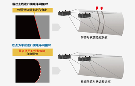 在曲面屏幕融合的應用場景下,可使用投影機自帶的黑電平調整功能,進行最多17個控制點的邊緣調整,增強多屏應用的融合效果。