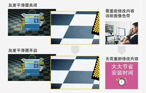 當投影內容色彩深度不足時,投影畫面容易出現色帶,開啟灰度平滑器,即可減輕灰度等級差異。在多屏融合的場景下,使用該功能可讓色彩過渡更加細膩自然,悅享大尺寸畫面的沉浸感。