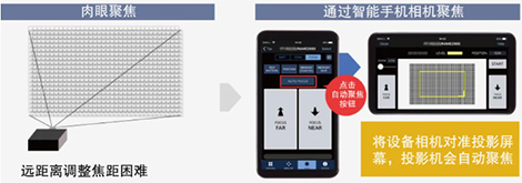 使用該功能,在手機端最多可對64臺投影機進行開機、關機、輸入選擇、設置調整、鏡頭調整等操作,在最遠30米的距離下進行自動聚焦。