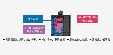 IP5X防塵等級的光學引擎和激光光源模塊,配合進一步升級的液體冷卻系統,可在多塵的環境下輕音低噪運行20,000小時,免于設備的反復維護。