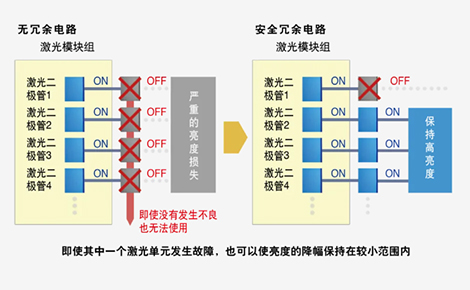 多驅動激光光學引擎設計將激光分為多個獨立的模組,即使其中一個激光單元發生故障,展演中的畫面也不會中斷,僅亮度小幅度降低。
