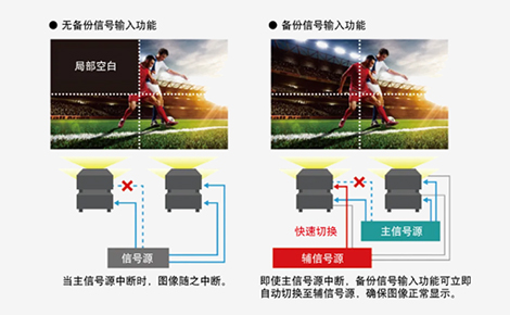 開啟備份信號輸入功能,在信號丟失的情況下,設備可在0.3秒內進行主備信號的自動切換,保障不中斷的畫面輸出。