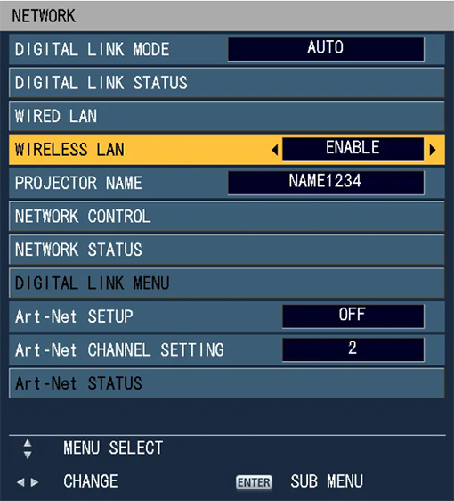 在投影機的屏幕菜單中選擇【網絡】→【無線局域網】→【啟用】