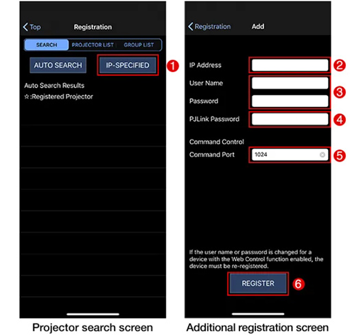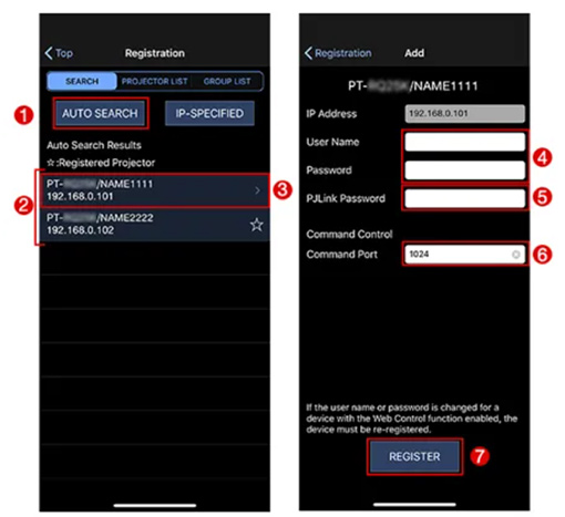 在“[PJLink密碼]”中輸入PJLink密碼。請輸入需要注冊的投影機中設置的PJLink密碼。PJLink使用的密碼可能與投影機網頁設置的登入密碼相同,或者根據投影機型號單獨設置為“PJLink密碼”。對于PJLink安全認證,請查看您的投影機使用說明。