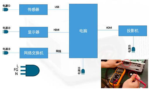 例如確認網(wǎng)絡交換機電源③的接地和投影機的電源⑤是否有電壓差