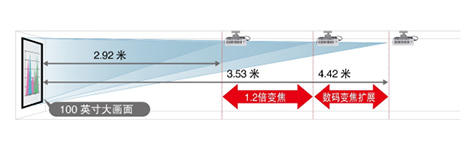當投影距離超出投影機光學變焦范圍時,可通過全新搭載的數碼變焦擴展功能擴展投影距離。如投影100寸畫面時,可由光學變焦的3.53米投影距離擴展至4.42米。