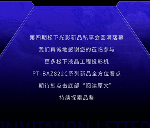 第四期松下光影新品私享會,我們真誠地感謝您的蒞臨參與,更多松下液晶工程投影機(jī)PT-BAZ822C系列新品全方位看點(diǎn),期待您持續(xù)探索品鑒。