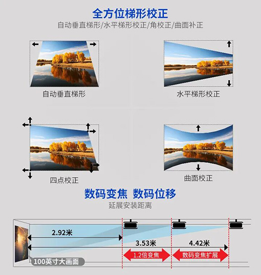 還搭載梯形校正、數(shù)碼變焦等多種功能,自由安裝更便捷。