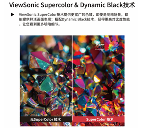 結合1080p全高清分辨率,LSD400HD-ST在畫面銳度、色彩飽和度與動態表現方面均達到專業級水準。支持藍光3D播放功能,用戶只需佩戴DLP Link 3D眼鏡即可享受沉浸式立體影像體驗,適用于教學演示、展覽展示及娛樂應用。此外,LSD400HD-ST支持4K信號輸入與HDR內容顯示,可呈現更豐富的亮暗細節與更廣的色彩層次,進一步提升視覺表現力。搭載ViewSonic SuperColor™廣色域技術與Dynamic Black技術,無論是明亮場景還是暗部細節,都能呈現層次分明、色彩鮮活的畫面。
