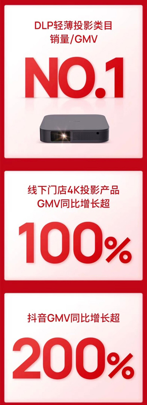 第一。這是極米第十次蟬聯(lián)投影品類(lèi)的全網(wǎng)冠軍,其中抖音平臺(tái)GMV同比增長(zhǎng)超200%。不僅線(xiàn)上持續(xù)增長(zhǎng),極米線(xiàn)下門(mén)店4K投影產(chǎn)品GMV也同比增長(zhǎng)超過(guò)了100%。